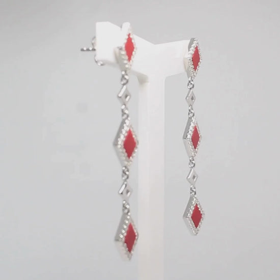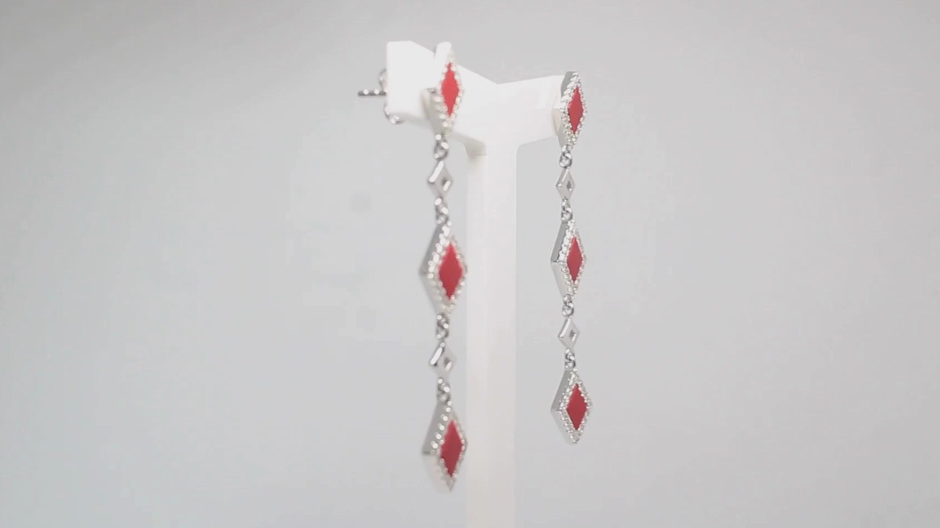 Eleganti orecchini pendenti dal design a rombi smaltati in un acceso rosso fuoco, realizzati in argento 925%. Arricchiti da luminose pietre Duraliti bianche, conferiscono un tocco di raffinatezza e brillantezza senza pari. La chiusura a farfallina garantisce comfort e sicurezza, perfetti per chi cerca un accessorio sofisticato da indossare in ogni occasione. Venduti in coppia per un look impeccabile.